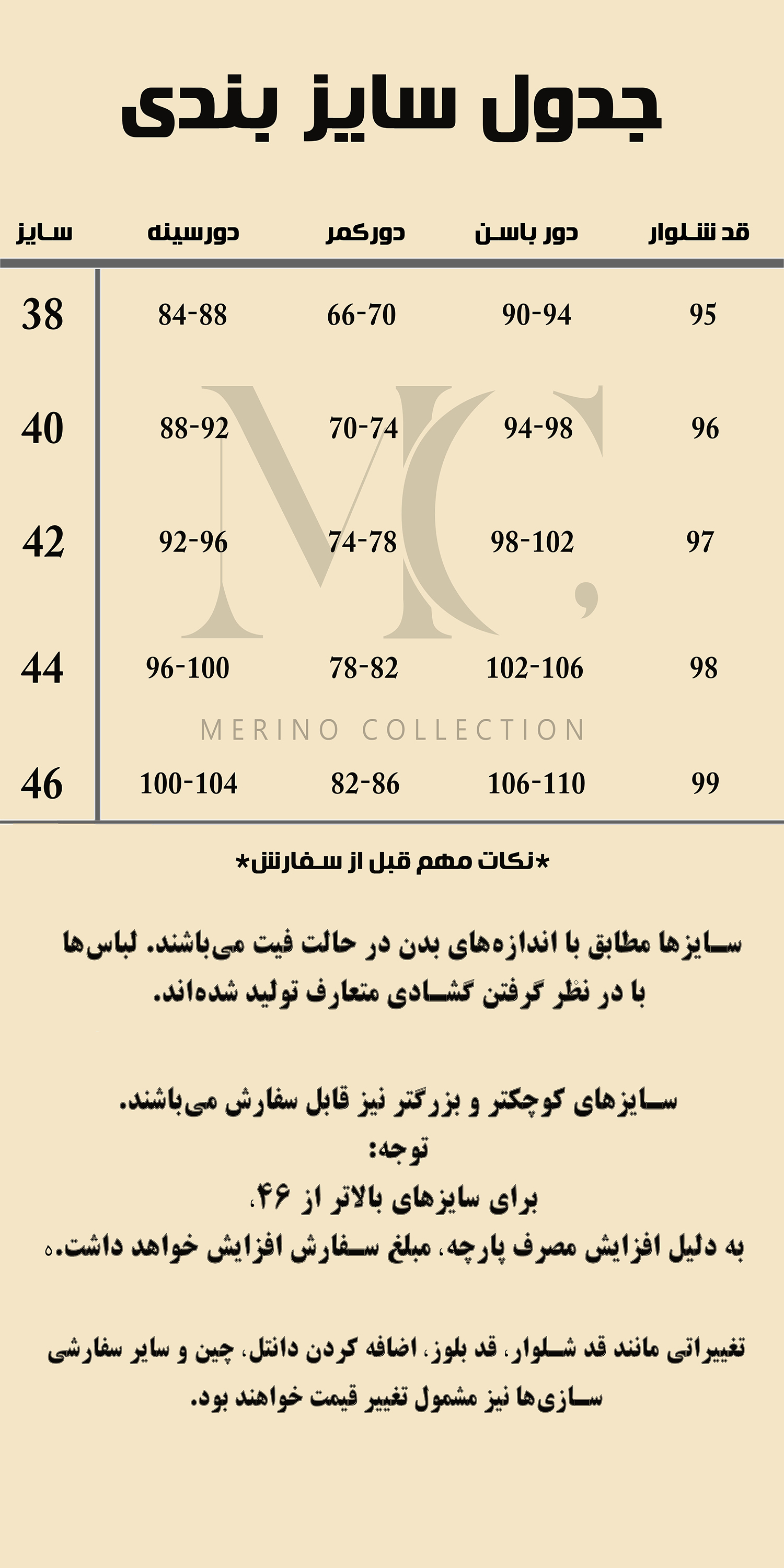 جهت راهنمای دقیق تر ملاک تولید و سایز بندی ما جدول زیر میباشید